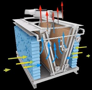 ACE’nin içine yerleştirilen güçlü fanlar yardımıyla, ortam havası, patentli anti-kirlenme “DUŞ” su dağıtım sistemi ile eşit şekilde ıslak bir PVC panelden iletilir.