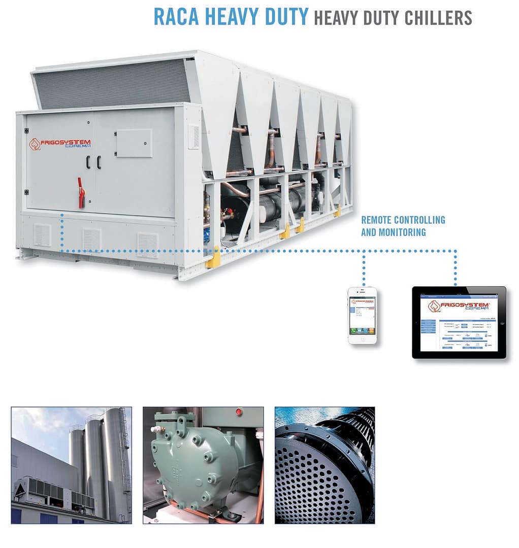 RACA-C serisi soğutucular, Scroll kompresörler ve bakım gerektirmeyen daldırma tipi evaporatör ile donatılmış kompakt iç ünitelerdir. Su veya su karışımları ve antifriz sıvıları gibi soğutma sıvıları için uygundurlar. Mevcut çok çeşitli versiyonlar ve basınç veya atmosferik basınç altındaki hidrolik devrelerde çok yönlülük sayesinde, RACA-C çeşitli performanslara sahip uygulamalar için ilginç ve sürekli çalışmaya uygun bir makinedir. Antifriz riskine karşı patentli tank ve buharlaştırıcı, yükteki ani değişikliklerde bile sabit su sıcaklıklarını garanti eder.