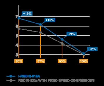 Bu, FRIGOSYSTEM i-RPE inverter teknolojisine sahip chiller’in daha yüksek verimliliğinin ortaya çıktığı tipik durumdur.