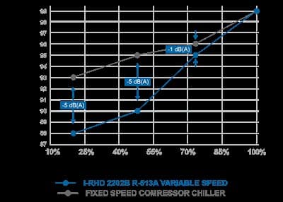 Kısmi yüklerde ünite, sabit hızlı kompresörlerle donatılmış karşılık gelen üniteden çok daha sessizdir. Yılın büyük bölümünde kısmi yüklerin olduğu uygulamalarda, I-RHD – 5 dB (A) ‘ya kadar son derece düşük gürültü sağlar.